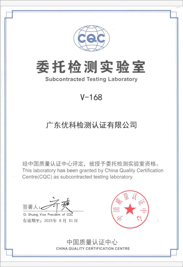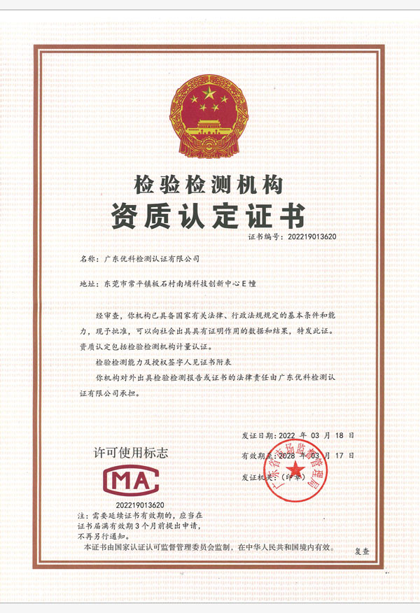 廣東優科檢測認證有限公司(簡稱:UKK)成?于2007年,是國內專業的汽車整車及零部件、電子元器件第三方檢測實驗室,國家級中小企業公共(技術)服務示范平臺,獲得了國家?新技術企業、廣東省專精特新中小企業、市級工程技術研發中心等榮譽稱號。 More